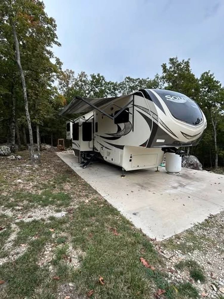 We are retired RVers who found a little slice of paradise in the Ozarks of southern Missouri that we’d love to share with you! Our quiet, secluded 12 acres, equipped with our Grand Design 43 foot Solitude residential 5th wheel, are located just 20 minutes from Branson Landing and Historic Downtown Branson, which offer great shopping and restaurants. Lake Taneycomo, with its great trout fishing and boating, flows gently beside the Landing. The Branson strip, where most of the live shows and other entertainment venues reside, are only a few minutes further! We are also within 7 minutes of the TexPlex off-road course for those who like a little more 4-wheeling adventure. We even have room to park your trailer and side by side next to the 5th wheel. Table Rock and Bull Shoals lakes are also conveniently located within 30 minutes of your campsite.